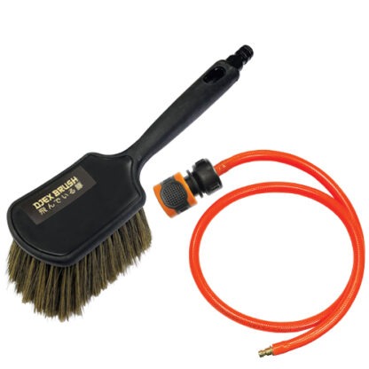 DjexBrush handborstel met waterdoorvoer uitgevoerd met een Gardena koppeling plus 1 meter slang en Rectus man. Op het oog een eenvoudige handborstel, maar niets is minder waar. Het water komt letterlijk gelijktijdig uit alle klossen. Tot stand gekomen door een bijzondere samenwerking tussen Djex en het befaamde merk FBK. Een ‘Must have’ voor de professionele glazenwasser.